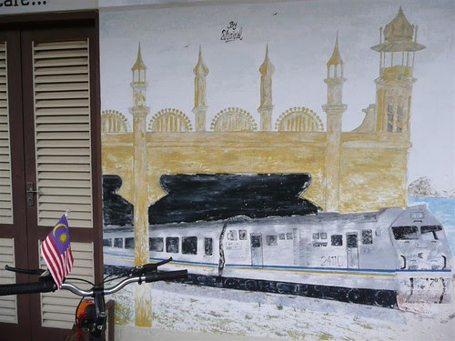 A picture of the Main Railway Terminal in Kuala Lumpur was painted on the wall of this railway station. It is quite old as the paint is starting to flake off. Ah, why did they paint a modern train in the grand Moorish architecture of that majestic building? One railway station advertising another – very generous of it. And someone parked a bicycle with a Malaysian flag against the wall, like that.